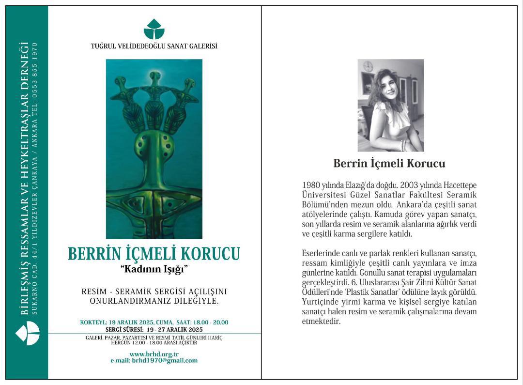 🎨 Kadının Işığı | Berrin İçmeli Korucu: Sanatçının Ankara’daki ilk kişisel sergisi, kadim idol figürlerinden beslenen seramik heykellerle tuval çalışmalarını bir araya getiriyor. Turkuaz ve ultramarin tonların hâkim olduğu eserlerde kadın; sezgisel bilgeliği, yaratıcı gücü ve yeniden doğma kapasitesiyle merkezde duruyor. Anadolu’nun kültürel hafızasından çağdaş bir anlatıya uzanan bu seçki, izleyiciyi zamanlar arası sessiz bir karşılaşmaya davet ediyor. 🗓 19-27 Aralık (Açılış: 19 Aralık Cuma 18.00’de) | 📍 Tuğrul Velidedeoğlu Sanat Galerisi
