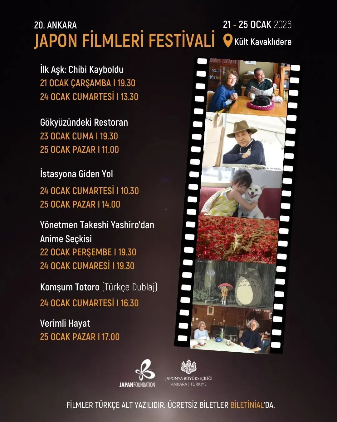 🇯🇵 🎬 20. Ankara Japon Filmleri Festivali için geri sayım başladı. Japonya Büyükelçiliği ve Japonya Tanıtma Vakfı iş birliğiyle düzenlenen festival, 21–25 Ocak tarihleri arasında Kült Kavaklıdere’de gerçekleşiyor. Klasiklerden yeni dönem yapımlara uzanan seçkide, Komşum Totoro, Verimli Hayat, İstasyona Giden Yol ve Gökyüzündeki Restoran gibi filmler beyazperdede olacak. Tüm gösterimler ücretsiz ancak yer numarası için biletlerin Biletinial üzerinden temin edilmesi gerekiyor. Biletler 16 Ocak saat 10.00’da açılıyor; gösterim programı ve biletler burada. Kaçırmamak için hatırlatıcınızı kurun.